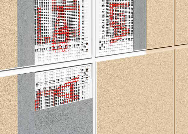 Наложите системную фасадную стеклосетку «внахлёст» поверх сетки профиля, обязательно закрывая ею перфорированные крылья.